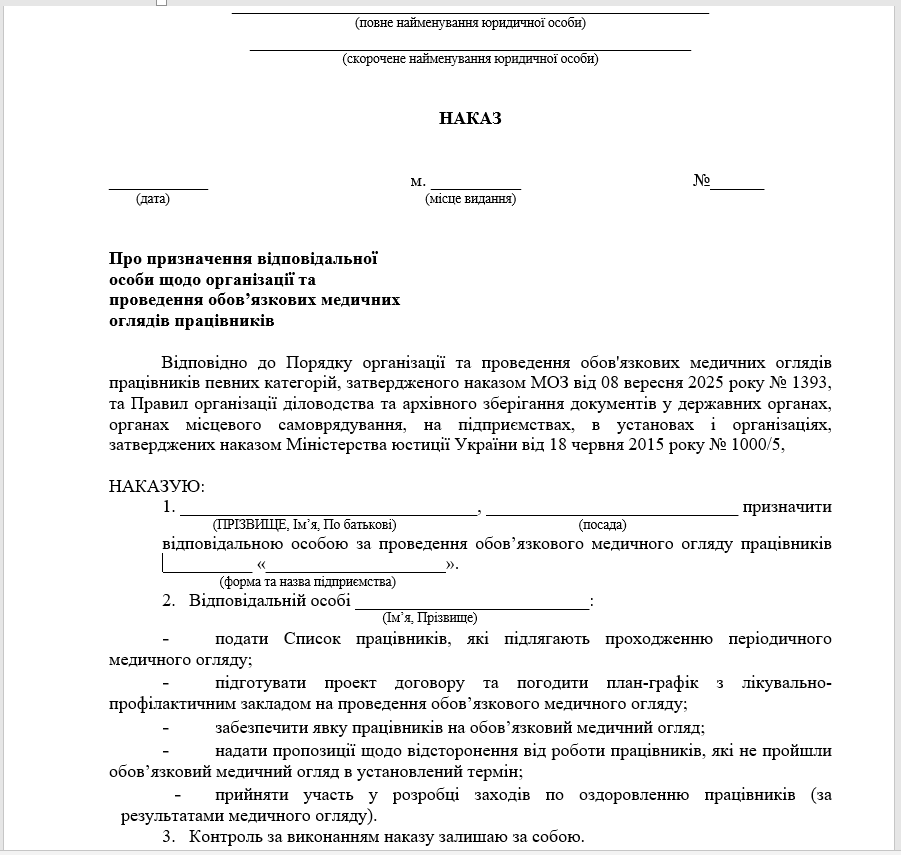 📋 Маємо для вас зразок та бланк Наказу про призначення відповідальної особи щодо організації та проведення обов’язкових медичних оглядів працівників.