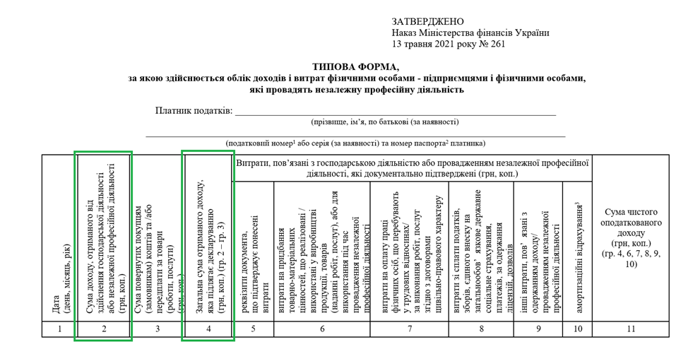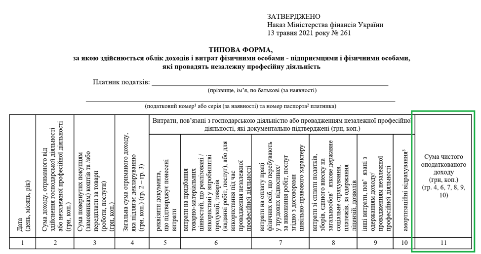 Для підприємців на загальній системі податківці (з подачі Мінфіну) будуть орієнтуватися на показник з графи 11 Типової форми обліку доходів і витрат — саме там фіксується чистий дохід.