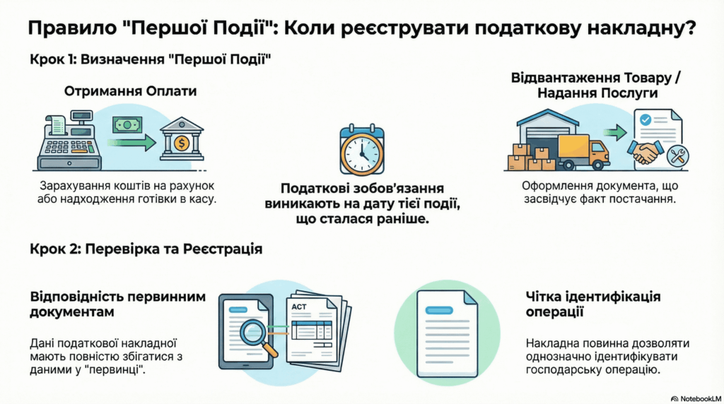 У контексті реєстрації податкової накладної (ПН) за “першою подією” важливо враховувати наступні аспекти: