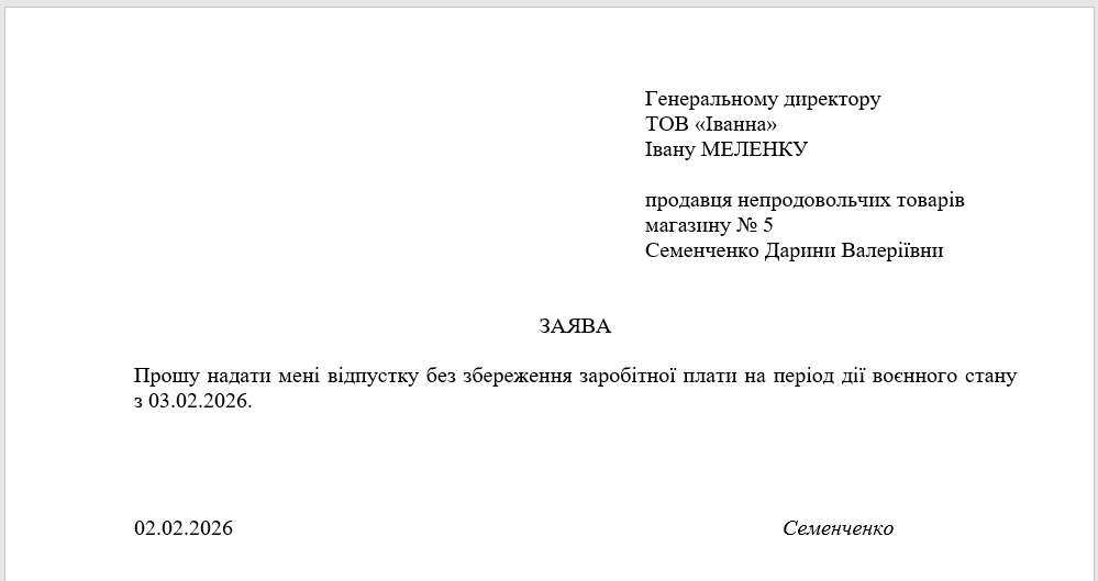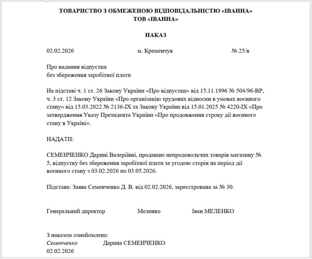 Відпустка за власний рахунок на період воєнного стану (з продовженням): заява та наказ