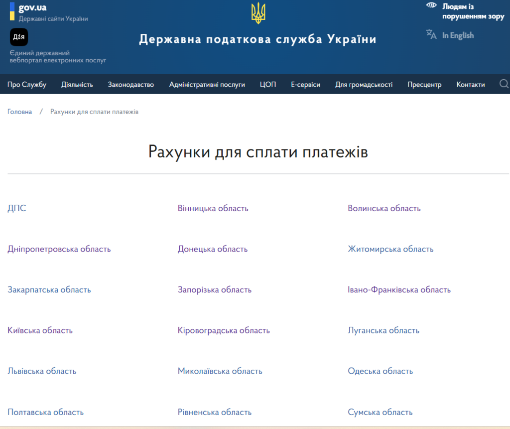 Рис. 2. Рахунки для сплати платежів на сайті ДПС України