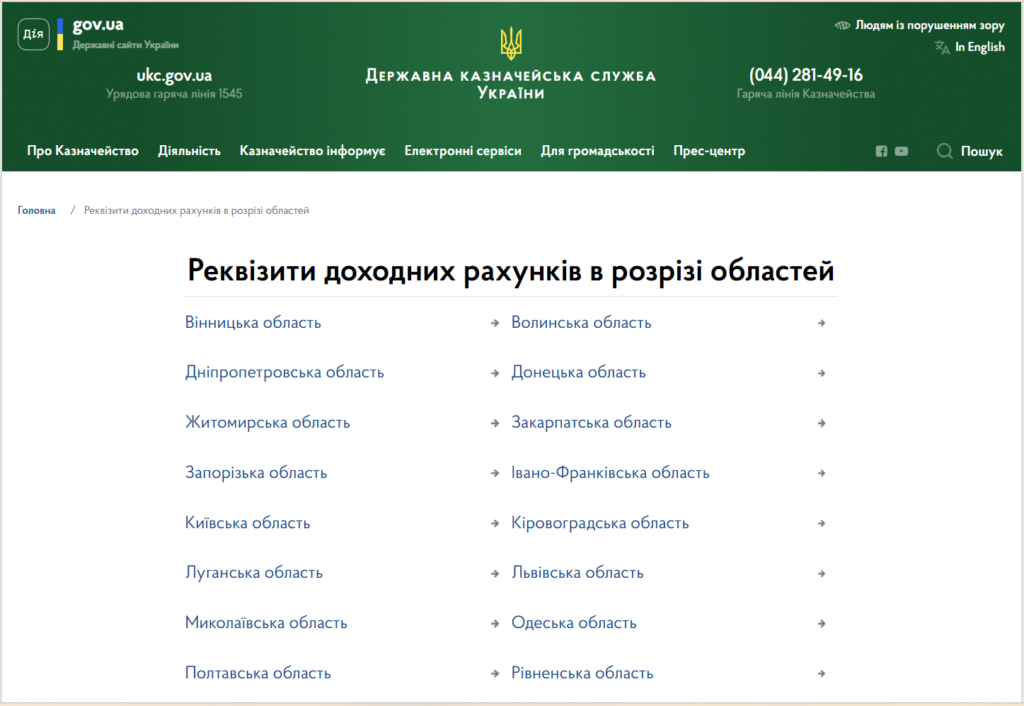 Рис. 1. Реквізити доходних рахунків на сайті ДКСУ