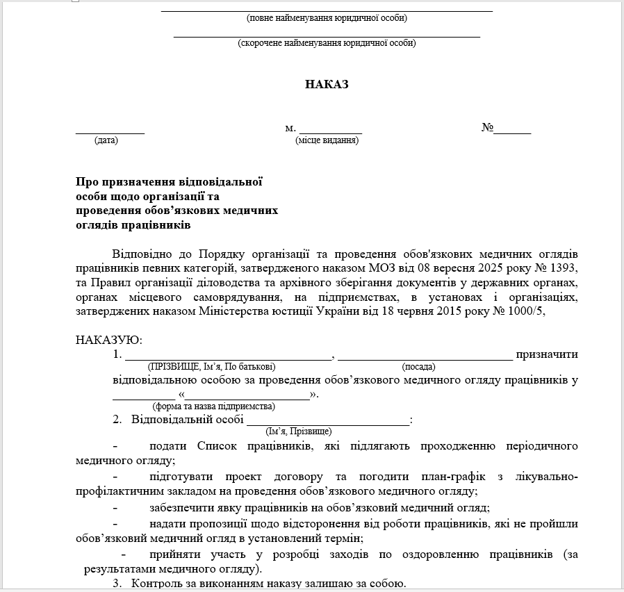 Завантажити бланк наказу можна тут 👉 Медогляди працівників: наказ про призначення відповідального