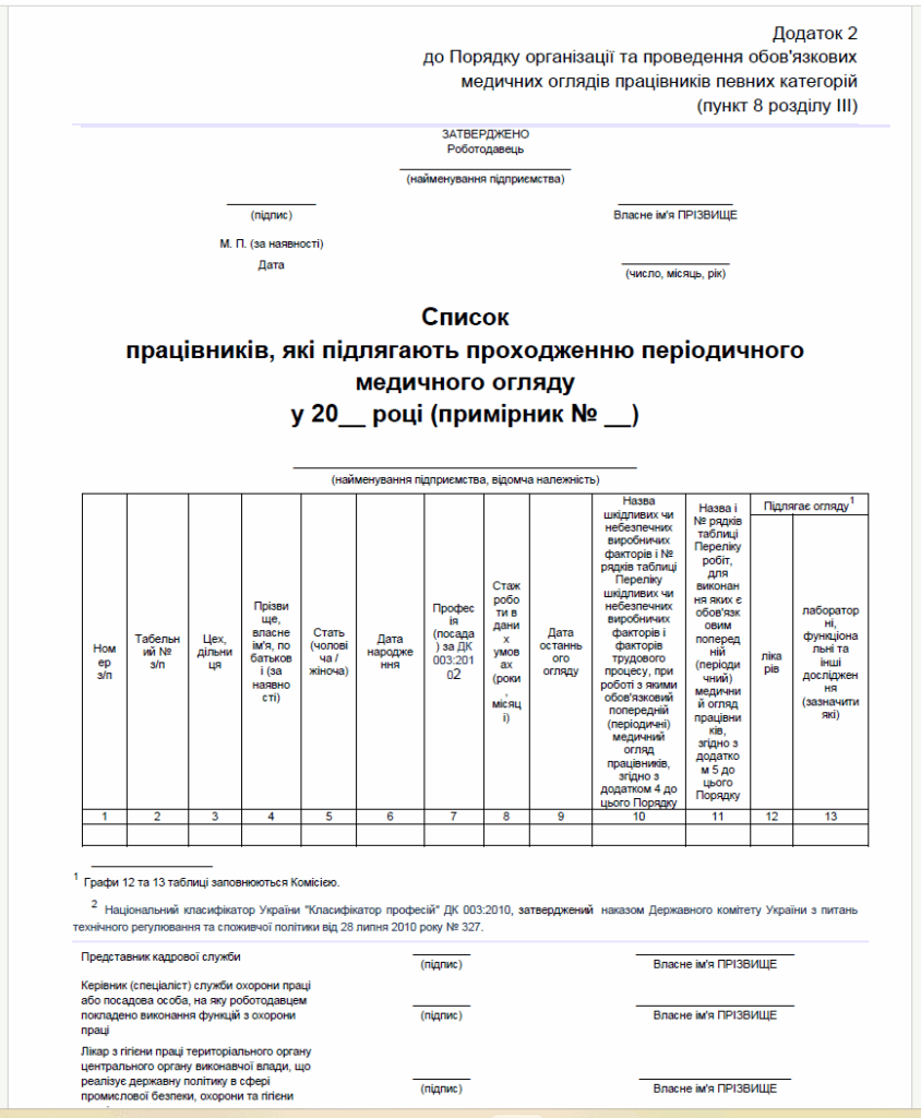 На основі погодженого Переліку роботодавець складає Список працівників, які підлягають періодичному медичному огляду у наступному році (форма — додаток 2 до Порядку № 1393).