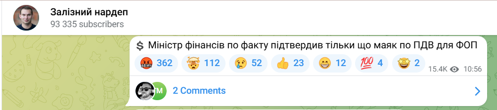 📢 Народний депутат Ярослав Железняк у своєму телеграм каналі опублікував пости, які підтверджують сумну новину для ФОП: Уряд має подати у Раду законопроєкт, який зробить реєстрацію платників ПДВ обов’язковою з 1 січня 2027 року для платників спрощених режимів з оборотом, що перевищує загальний поріг реєстрації ПДВ ( на рівні 1 млн грн).