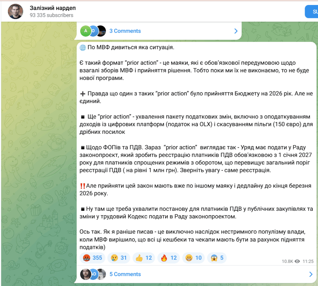 ‼️ Останнім часом активно обговорюють вимогу МВФ про введення обов’язкової реєстрацію платником ПДВ ФОП із доходом 1 млн грн. Чи є підтвердження інформації?
