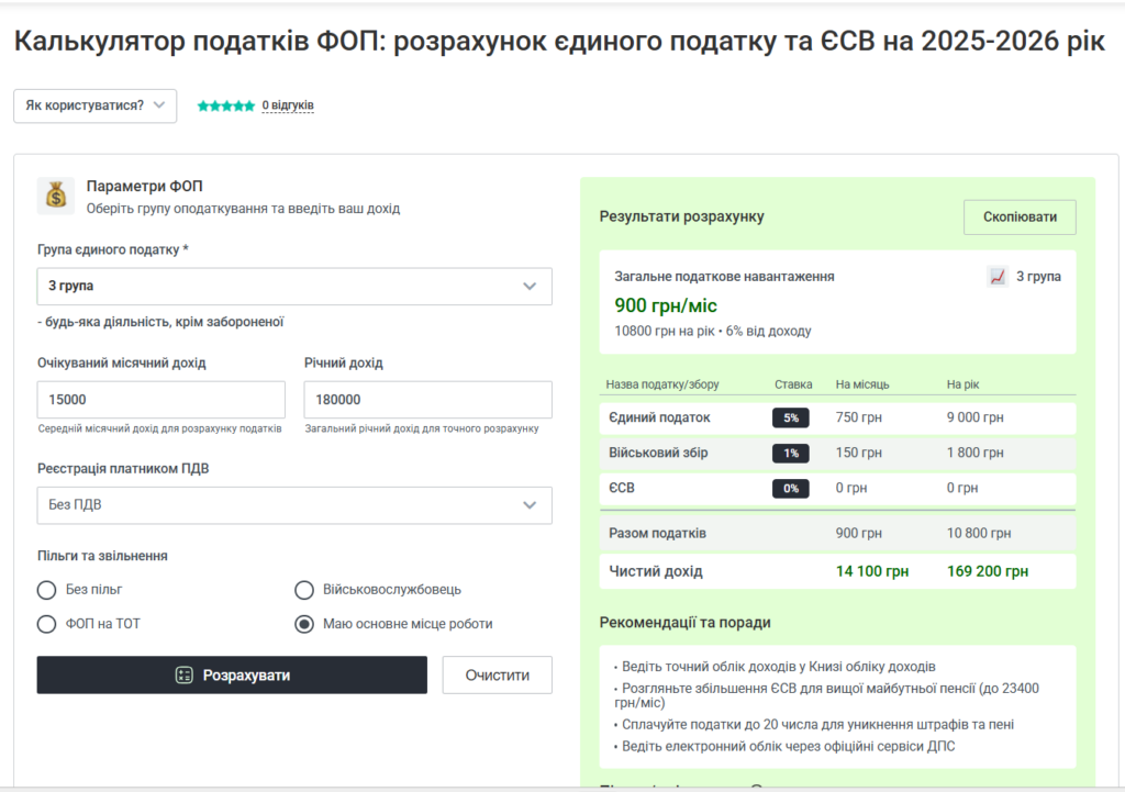 На сайті Фактор є корисний та легкий Калькулятор податків ФОП: розрахунок єдиного податку та ЄСВ на 2025-2026 рік