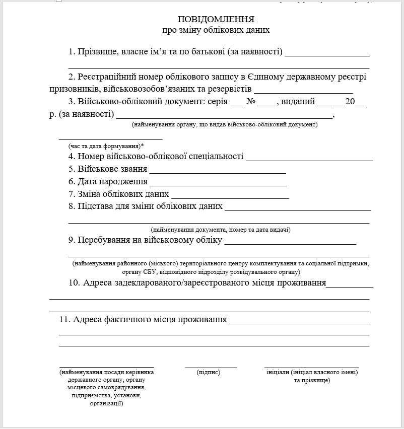 📝 З 16.12.2025 Постановою КМУ від 10.12.2025 р. № 1644 внесено зміни до Порядку організації та ведення військового обліку № 1487. Серед іншого викладно в новій редакції Повідомлення про зміну облікових даних (додаток № 4).