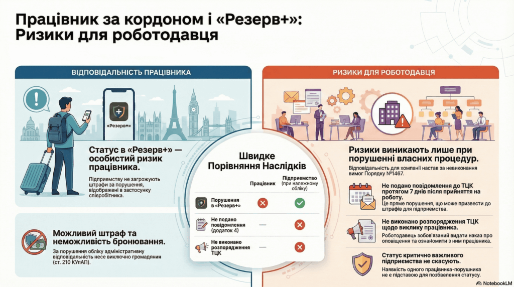 Підприємству нічого не загрожує лише через те, що у працівника в застосунку «Резерв+» відображається порушення правил військового обліку. Особистий статус працівника у «Резерв+» є його індивідуальним ризиком, який може призвести до штрафу для самого працівника та неможливості отримання бронювання, але не створює автоматичної відповідальності для роботодавця.
