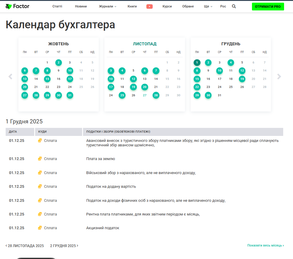 | 19 декабря (пятница) | Авансовый взнос по единому налогу ФЛП групп 1 и 2 за декабрь 2025 года Авансовый взнос по военному сбору ФЛП плательщиками ЕН группы 1, 2, 4 за декабрь 2025 года Авансовый взнос по налогу на прибыль предприятиями — розничными торговцами горючим за декабрь 2025 года Авансовый взнос по НДФЛ ФЛ ФЛП на общей системе налогообложения — розничными торговцами горючим за декабрь 2025 года |