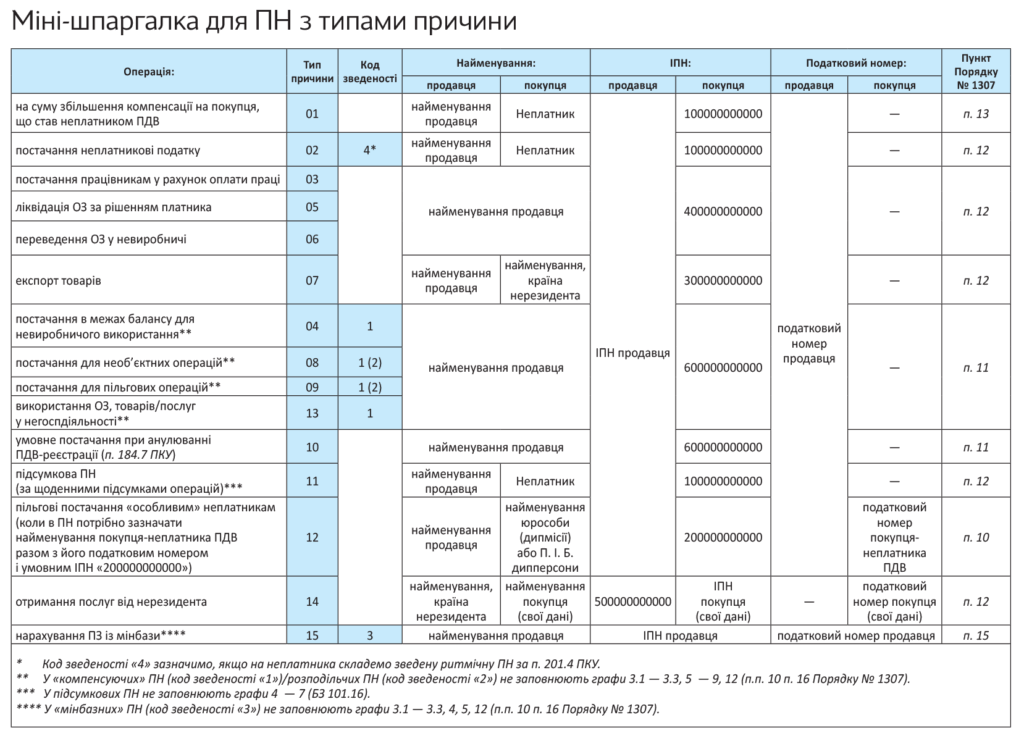 Как заполнить итоговую НН? Начнем с таблички в левом верхнем углу итоговой НН. Здесь делают отметку «Х» и проставляют тип причины «11 » — «Складена за щоденними підсумками операцій»(п. 8 Порядка № 1307).