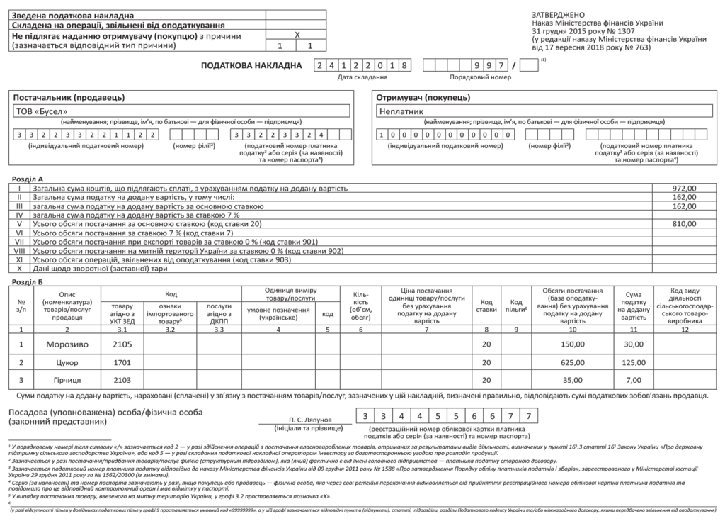 Например, налоговый номер покупателя не нужно указывать в НН, составленных на неплательщиков, в том числе в итоговых НН, в которых вместо названия покупателя пишем «Неплатник».