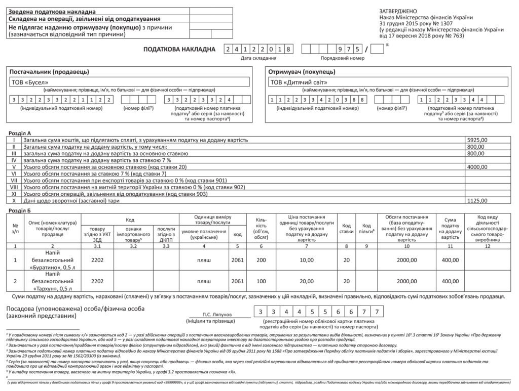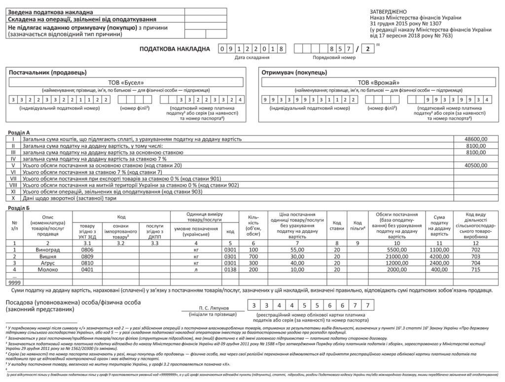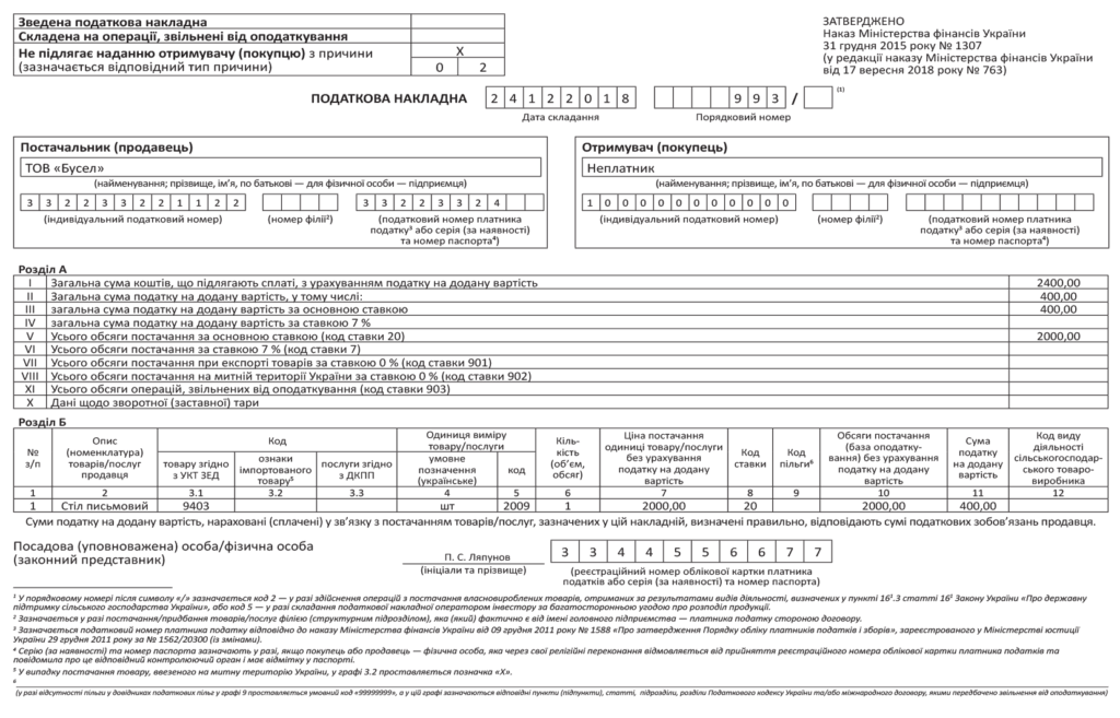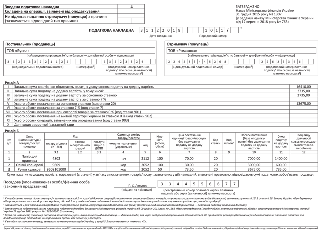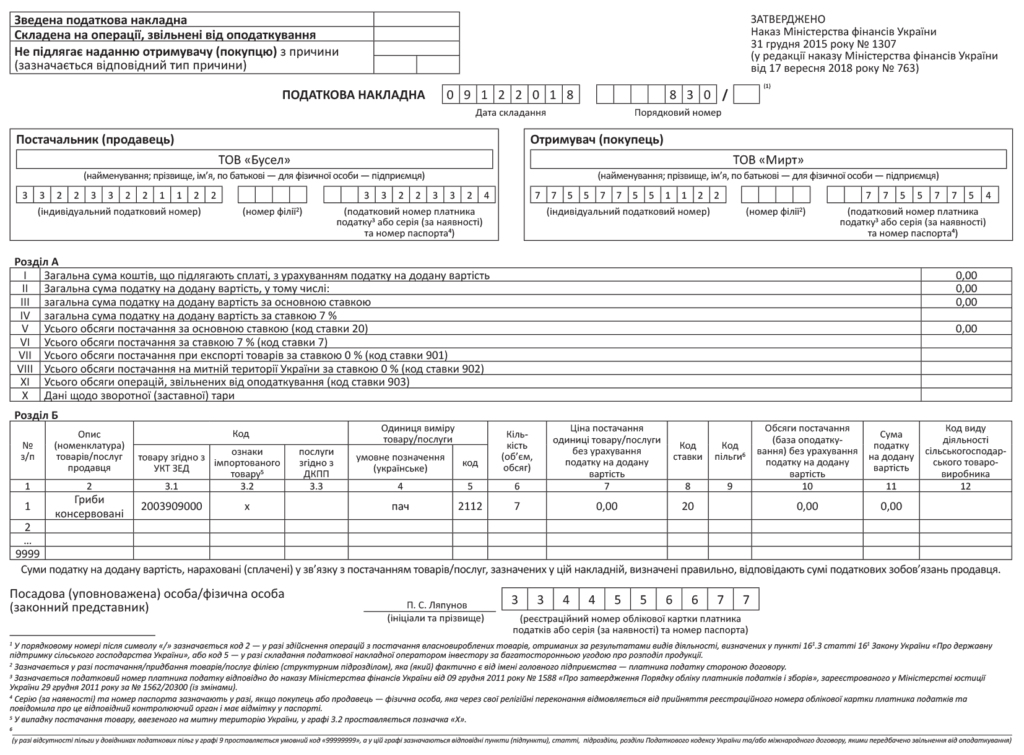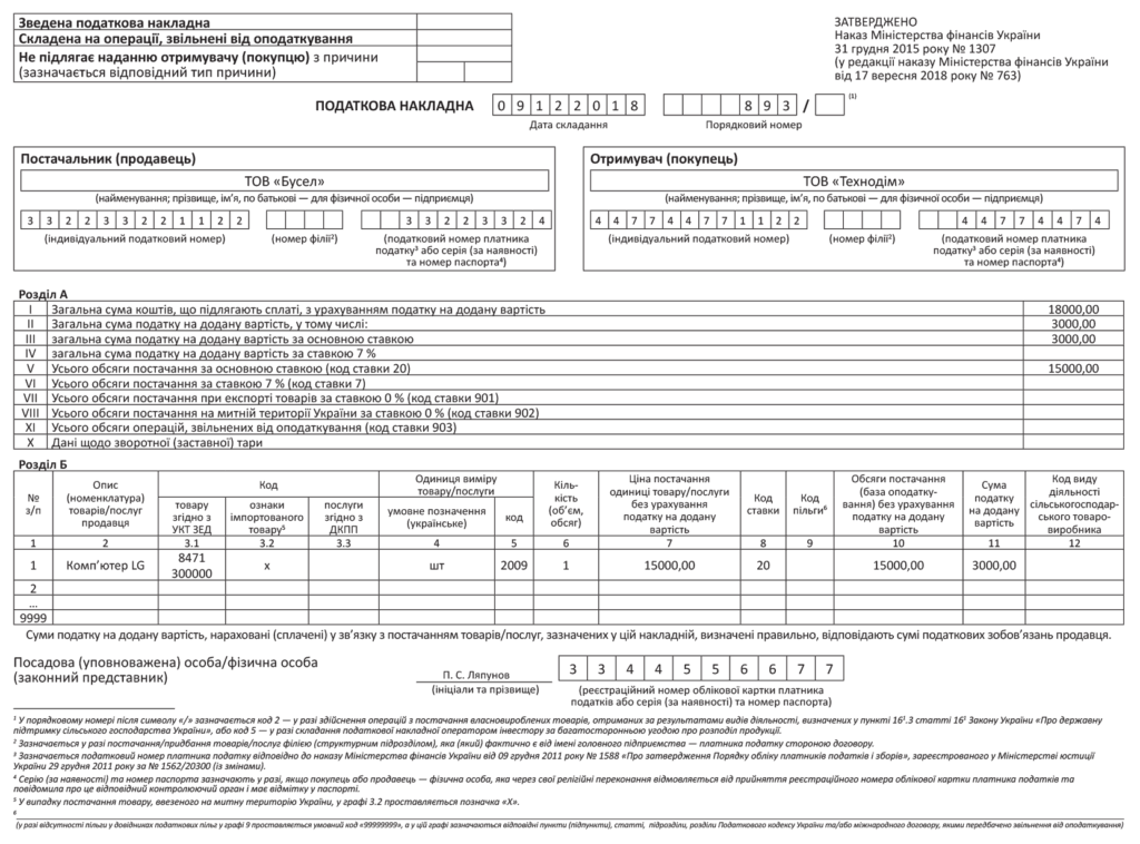 Порядок № 1307 — Порядок заполнения налоговой накладной, утвержденный приказом Минфина от 31.12.2015 г. № 1307.