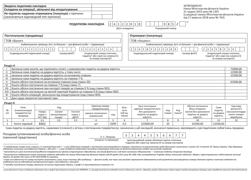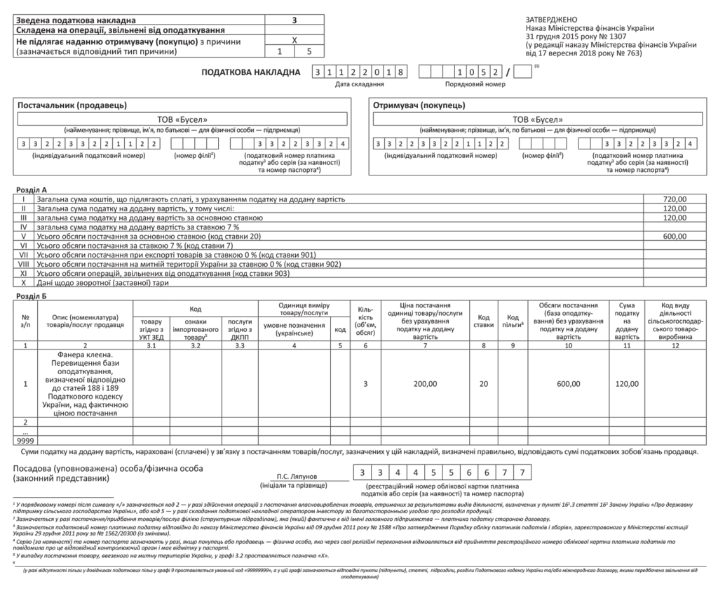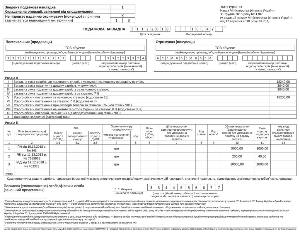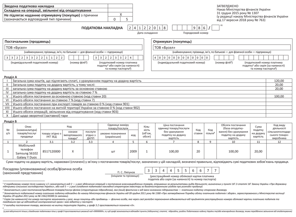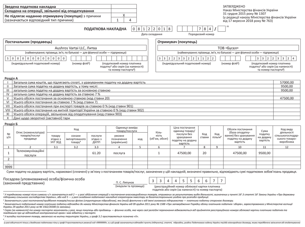 Порядок № 1307 — Порядок заполнения налоговой накладной, утвержденный приказом Минфина от 31.12.2015 г. № 1307.