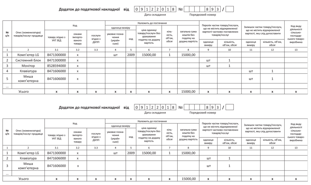 А вот если договор наряду с выполнением работ/услуг предусматривает также поставку товаров, тогда в графе 2 придется отдельными строками перечислить номенклатуру отгруженных товаров, а также наименование предоставленной услуги/выполненных работ, а в графах 3.1 и 3.3 НН — коды товаров согласно УКТ ВЭД и код услуги согласно ДК 016:2010 (см. письмо ГФСУ от 11.10.2018 г. № 4387/6/99-99-15-03-02-15/ІПК).