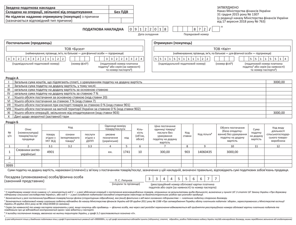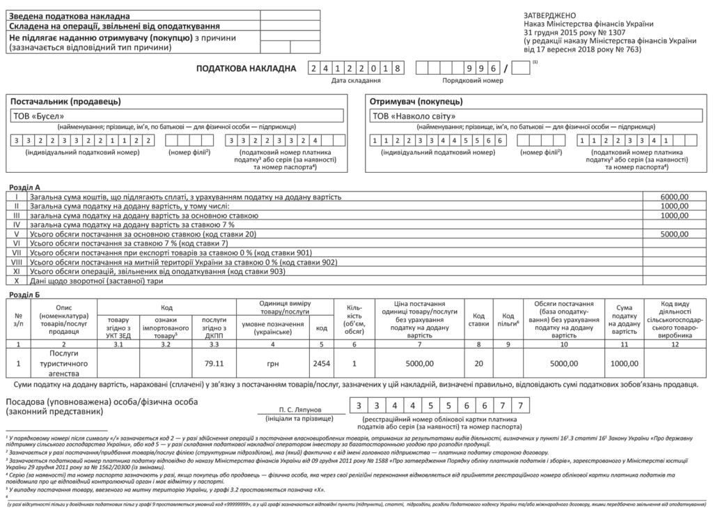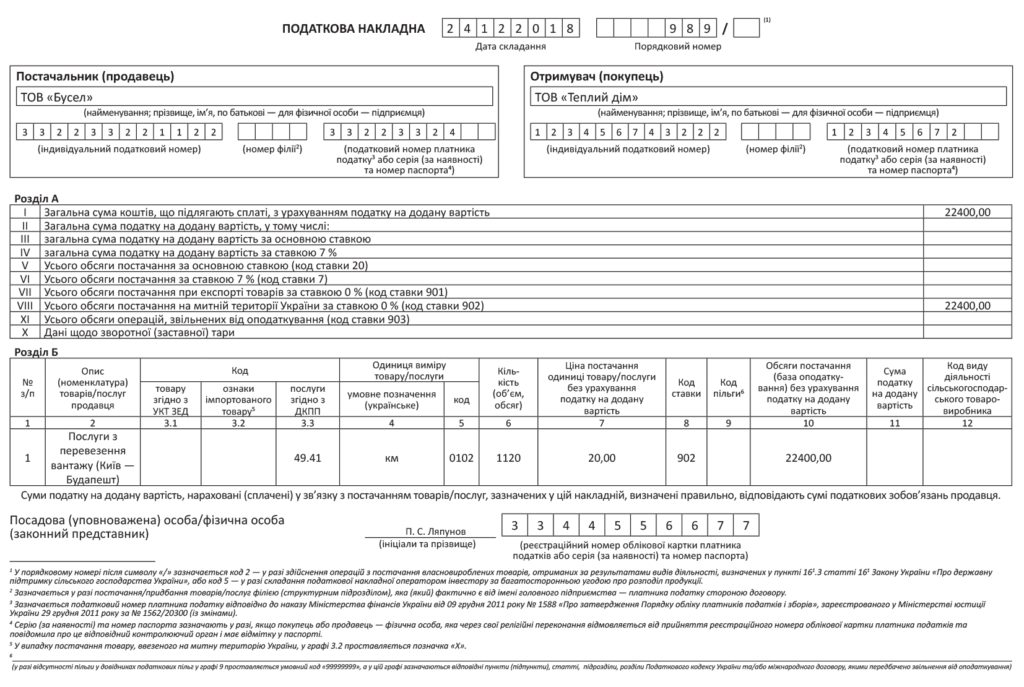 — в графе 2 «Опис (номенклатура) товарів/послуг продавця » — наименование предоставляемой услуги. При этом желательно детализировать маршрут перевозки;