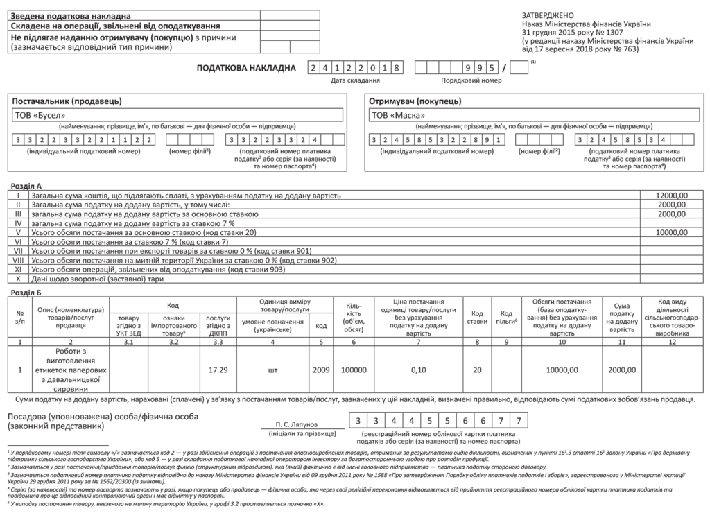 Новый реквизит «Податковий номер». Начнем с принципиально нового поля обновленной НН, которым она пополнится с 01.12.2018 г. — «податковий номер платника податку або серія (за наявності) та номер паспорта». Заполнить его не составит труда, ведь здесь указывают: