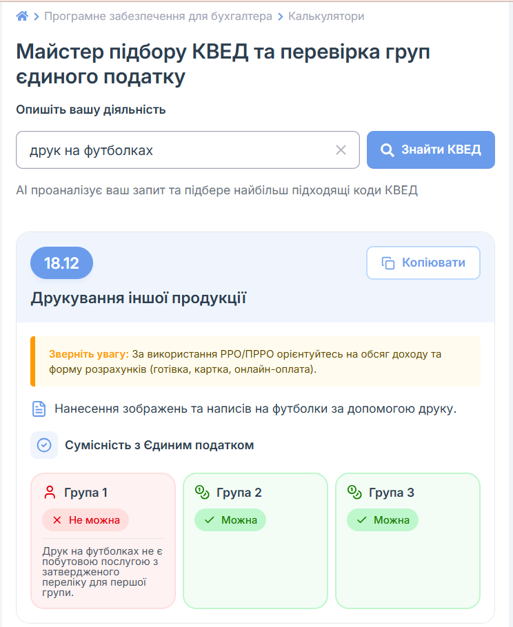 Крое этого у нас есть для вас чудесный функционал на сайте Бухгалтер 911 Майстер підбору КВЕД та перевірка груп єдиного податку