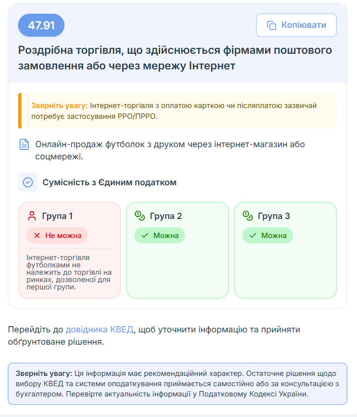 ‼️ Обратите внимание: Эта информация носит рекомендательный характер. Окончательное решение о выборе КВЭД и системы налогообложения принимается самостоятельно или по консультации с бухгалтером. Проверьте актуальность информации в Налоговом кодексе Украины.