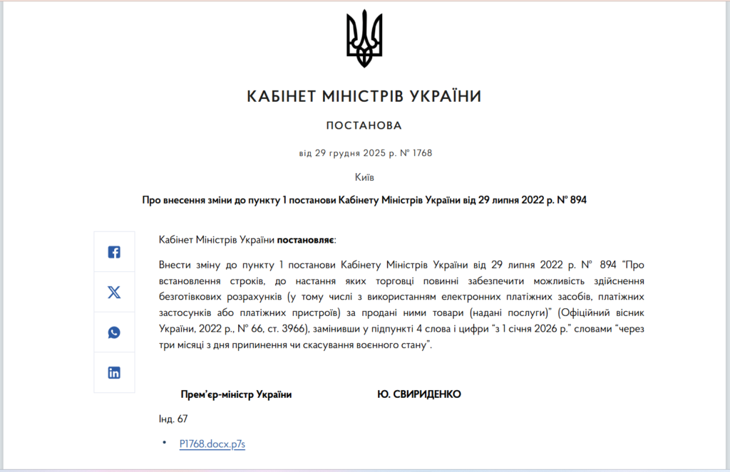 Постановлением КМУ от 29 декабря 2025 г. № 1768 предусмотрено перенести срок, с которого обязанность обеспечения безналичных расчетов будет возникать для таких категорий: