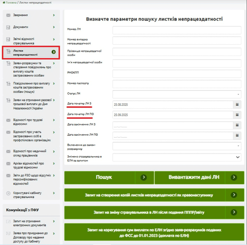 У меню зліва оберіть розділ «Листки непрацездатності». Вкажіть період початку тимчасової непрацездатності працівника і натисніть «Пошук».