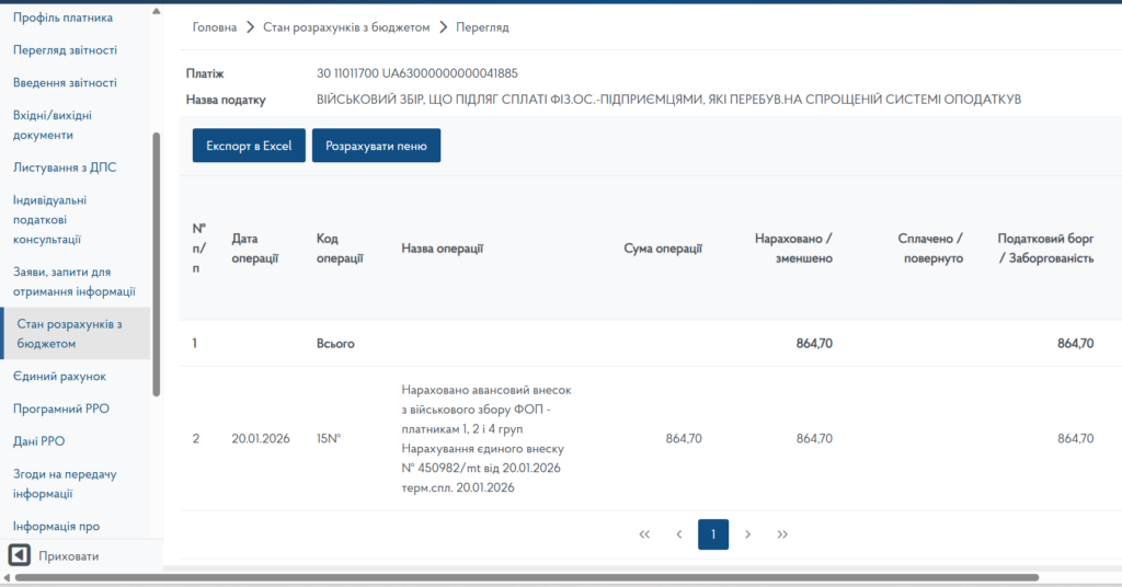 Авансовий внесок з військового збору на січень 2026 року вже нараховано вірно: в сумі 864,70 грн. Тобто це 10 % від мінімальної зарплати (8647 грн).