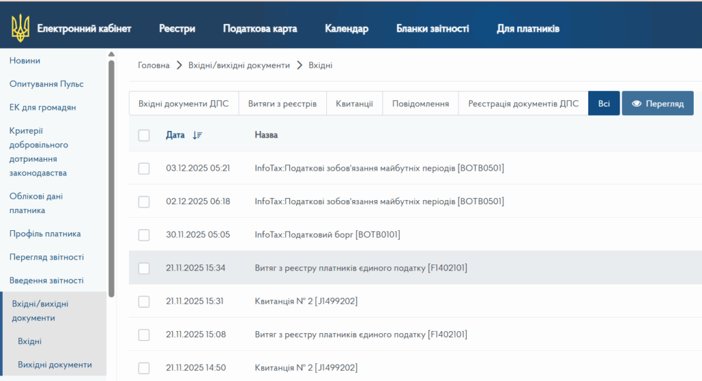 Важливо перевірити розділ “Вихіді /Вихідні документи”, зокрема, вхідні. Там можуть бути важливі повідомлення від податкової, які ви пропустили.