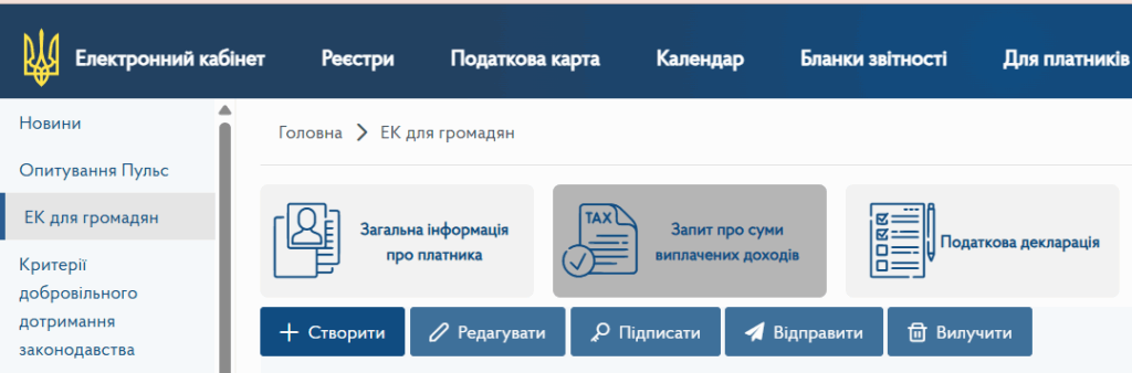 3️⃣ У розділі Е-кабінету для громадян створіть Запит про суми виплачених доходів і отримайте: