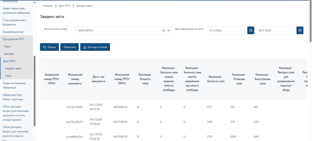У Е-кабінеті (розділ Зведені звіти) можна завантажити звіт у форматі Excel за фіскальним номером РРО.