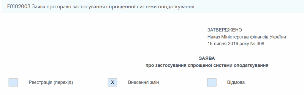 У шапці Заяви поставте позначку «Х» у полі «Внесення змін».
