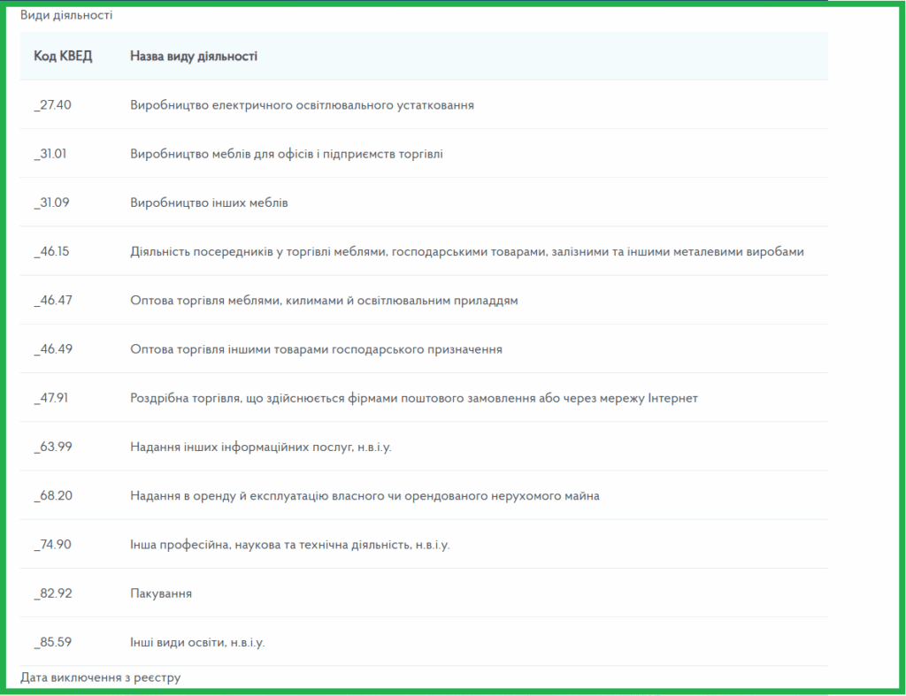 - Види діяльності (Код КВЕД + Назва виду діяльності)