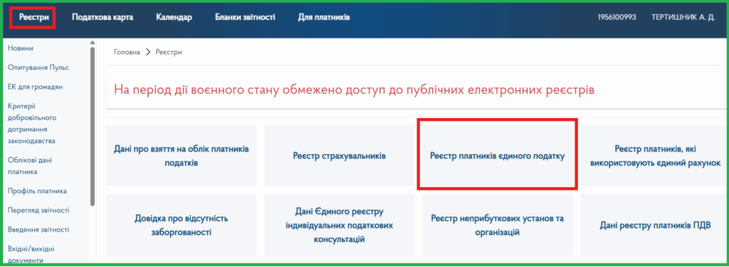 1️⃣ Авторизуватись у Електронному кабінеті платника ДПС. Увійти в розділ Реєстри. Обрати Реєстр платників єдиного податків.