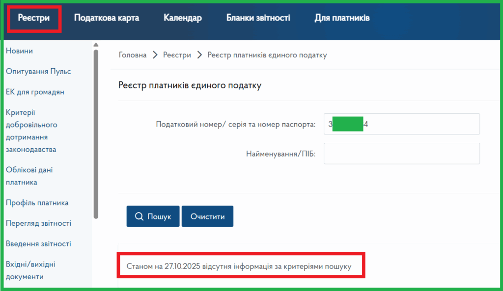 Якщо він не є платником єдиного податку, то внизу буде вказано, що станом на дату відсутня інформація за критеріями пошуку.