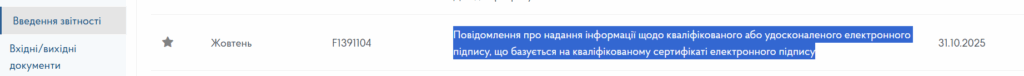 Ось детальна інструкція щодо подання Повідомлення про надання інформації щодо кваліфікованого або удосконаленого електронного підпису, що базується на кваліфікованому сертифікаті електронного підпису за формою F1391104.