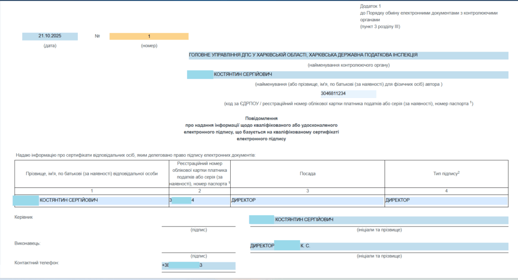 Як заповнити Повідомлення за формою F1391104 про новий електронний підпис ФОП