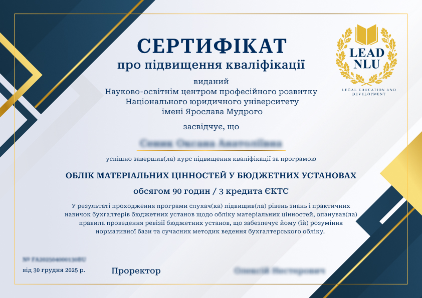 Після навчання ви отримаєте сертифікат від Науково-освітнього центру професійного розвитку Національного юридичного університету імені Ярослава Мудрого